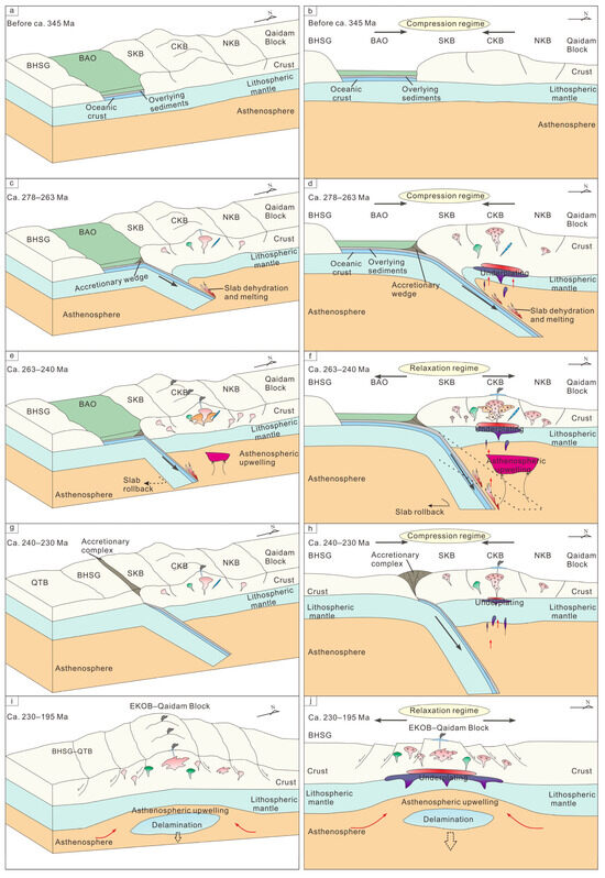 The EKOB, situated along the northern margin of the Tibet Plateau in northwest China (Figure 1a), is bounded by four principal tectonic domains: the Qaidam Block to the north, the A’nyemaqen Ophiolitic Belt (AOB) to the south, the Altyn Tagh strike-slip fault system to the west and the Wenquangou–Wahongshan fault to the east (Figure 1b). This orogen extends approximately 1500 km in an E–W direction with a width of 50–200 km [10]. Wutumeiren Township divides the EKOB into western and eastern sectors [38]. The EKOB is subdivided into three belts: the Caledonian back-arc basin of Northern East Kunlun Orogenic Belt (NKB), the uplifted granitic basement of Central East Kunlun Orogenic Belt (CKB) and the composite accretion of the Southern East Kunlun Orogenic Belt (SKB) from north to south, respectively (Figure 1b). The boundaries of each belt are the Northern East Kunlun fault (NEKF, also named as Nalinggele Fault in the western EKOB), the Central East Kunlun fault (CEKF) and the Southern East Kunlun fault (SEKF) from north to south, respectively (Figure 1b) [10,39]. The NKB and CKB exhibit spatial heterogeneity with the SKB. (1) The basement compositions of the NKB and CKB are of the Paleo-Proterozoic Jinshuikou Group, including Baishahe and Xiaomiao Formations, which are mainly composed of gneiss, marble, migmatite and metasedimentary rocks. Thick sedimentary strata have developed on the top of these basements, which include the Meso- to Neo-Proterozoic Binggou Group, Ordovician Tanjianshan Group, Upper Devonian Maoniushan Formation, Carboniferous Shiguaizi, Dagangou and Di’aosu Formations, Permian Dachaigou Formation and Upper Triassic Elashan Formation. (2) The basement compositions of the SKB are of the Meso- to Neo-Proterozoic Wanbaogou Group, which is mainly composed of basaltic oceanic plateau and overlying meta-volcanic and metasedimentary rocks. Similar to the NKB and CKB, the SKB also features the development of thick sedimentary strata, such as the Ordovician–Silurian Nachitai Group, Carboniferous Halaguole and Haoteluowa Formations, Permian Gequ Formation and Triassic Hongshuichuan, Naocangjiangou and Babaoshan Formations [39]. The EKOB records a protracted tectonic evolution involving (1) Cambrian–Devonian Proto-Tethys Ocean and Carboniferous–Triassic Paleo-Tethys Ocean [10,11,13,14,19,39,40]. Notably, Phanerozoic granitoids cover an area of approximately 47,500 km2, with Permian–Triassic granitoids accounting for 23,000 km2 (approximately 48% of total exposure) [38].