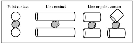 As shown in Figure 1, the difference in contact mechanisms between rod media (line contact) and ball media (point contact) with mineral particles may explain this phenomenon [26]. Cylpebs exhibit characteristics of both line contact (like rods) and point contact (like balls) when interacting with minerals, making them a media shape of growing interest. Some studies have shown that cylpebs achieve a higher breakage rate than balls (particularly more pronounced with larger feed particle sizes) [18] and are conducive to selective grinding, avoiding over-grinding [27,28]. When investigating the grinding efficiency of ball milling and cylpeb milling for +74 μm material, Jiahong et al. found [29] that cylpeb milling was more efficient for grinding times shorter than 142 s, while ball milling became more efficient for grinding times exceeding 142 s. At a grinding time of 180 s, the −74 μm fraction in ball-milled samples reached 74.23%, which was 12.08% higher than that of cylpeb-milled samples. They proposed that balls exhibit an equal probability of collision with particles across all size fractions, whereas cylpebs, due to their combined characteristics of rod-like line contact and ball-like point contact (with line contact being dominant), have a significantly higher collision probability with coarse particles compared to fine particles. Consequently, as grinding time increases and particle size decreases, cylpebs primarily break down coarse particles while providing a protective effect on fine particles, thereby preventing over-grinding.