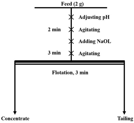 Single-mineral micro-flotation experiments were conducted using an XFG-type flotation machine by Jilin Province Prospecting Machinery Factory, China. The impeller speed of the flotation machine was set to 1700 rpm. In total, a 2 g sample of the milled single mineral and 35 mL of deionized water were placed in a 40 mL flotation cell. The pulp pH was adjusted using 5% NaOH and H2SO4 solutions. After agitating for 2 min, the collector ( = 2 × 10−4 mol/L) was added, and agitation was continued for an additional 3 min. Flotation was then initiated and maintained for 3 min. After flotation, the concentrate was filtered, dried, and weighed to calculate the recovery rate. The overall procedure of micro-flotation is illustrated in Figure 2. Each experiment was repeated three times, and the average value was taken as the final result.