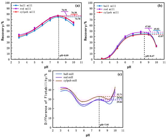 To investigate the effects of different grinding media shapes on the grinding characteristics of ilmenite and titanaugite, micro-flotation experiments were conducted on pure mineral samples of ilmenite and its primary gangue mineral, titanaugite, at various pH levels. The experimental results were fitted to curves, as shown in Figure 3. From Figure 3a, it can be observed that the flotation recovery of ilmenite generally increases and then decreases with increasing pulp pH. Specifically, starting from pH = 3, the recovery of ilmenite increases with pH, reaching a maximum at approximately pH ≈ 8, after which the recovery gradually decreases with further increases in pH. Comparing the recovery rates of products milled with different media shapes under the same pH conditions, the recovery of cylpeb-milled products is generally higher than that of ball-milled products but slightly lower than that of rod-milled products. The maximum recovery of cylpeb-milled products reaches 76.38% at pH = 8.09, while the recoveries of rod-milled and ball-milled products are 76.91% and 74.70%, respectively. Figure 3b shows the recovery rates of titanaugite milled with different media at various pH levels. Similar to ilmenite, the flotation recovery of titanaugite initially increases and then decreases with increasing pH. The recovery of cylpeb-milled titanaugite reaches a maximum of 43.87% at pH = 8.47, while the recoveries of rod-milled and ball-milled products are 47.85% and 45.02%, respectively. By calculating the difference in recovery rates between ilmenite and titanaugite, the floatability difference curves for products milled with different media were obtained, as shown in Figure 3c. The floatability difference curves for ilmenite and titanaugite exhibit a “W” shape, with the overall trend being cylpebs > rods > balls. The floatability difference for cylpeb-milled products reaches a maximum of 32.71% at pH = 7.95, while the differences for rod-milled and ball-milled products are 29.04% and 29.96%, respectively. Therefore, considering both the recovery of ilmenite and the floatability difference between ilmenite and titanaugite, a weakly alkaline environment at pH = 8 is most suitable for the flotation separation of ilmenite in the ilmenite/titanaugite/NaOL system. Additionally, using steel cylpebs as grinding media enhances the floatability difference between ilmenite and titanaugite, improving it by 3.67% and 2.75% compared to rod grinding and ball grinding, respectively.