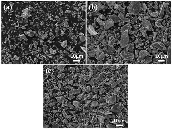 The SEM images of the three milled samples of ilmenite are shown in Figure 4. Morphologically, the rod-milled samples exhibit the coarsest overall particle size, with particles predominantly elongated in shape. The ball-milled samples have a finer overall particle size, with mostly irregular polygon-sized particles. The cylpeb-milled samples showed an intermediate particle size, with particle morphology combining characteristics of both ball-milled and rod-milled samples. The images were processed using Image-Pro Plus 6.0 software to calculate and E of each sample, and the results are presented in Table 3. The data are generally consistent with the morphological characteristics directly observed from the SEM images.