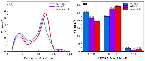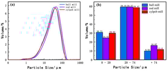 Figure 6 presents the particle size distribution of titanaugite. Figure 6a indicates that the overall particle size of titanaugite is smaller than that of ilmenite. Additionally, the ball-milled sample is significantly finer than the rod-milled and cylpeb-milled samples. Research [33,34] has shown that when the content of titanium particles smaller than 10 μm exceeds 40%, the recovery of ilmenite decreases significantly. In contrast, coarser titanaugite particles have a lesser impact on ilmenite recovery. As shown in Figure 6b, the contents of −10 μm particles in the ball-milled, rod-milled, and cylpeb-milled titanaugite samples are 50.88%, 42.97%, and 38.61%, respectively. The high content of fine particles in the ball-milled and rod-milled samples, exceeding 40%, is unfavorable for ilmenite recovery. Therefore, selecting steel cylpebs as the grinding medium is more conducive to avoiding the generation of fine titanaugite particles.