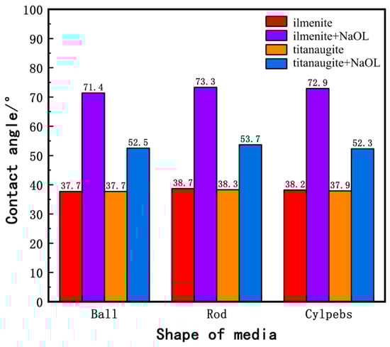 The contact angle is a measure of surface hydrophobicity, and its magnitude directly reflects the hydrophilicity or hydrophobicity of a mineral. Figure 7 presents the contact angle measurements of water on the milled products of ilmenite and titanaugite before and after interaction with the collector NaOL. The bar chart shows that, prior to interaction with NaOL, the contact angles of all milled products of ilmenite and titanaugite are relatively small, around 38°, indicating strong hydrophilicity. Although the contact angles of products milled with different media shapes vary slightly, these differences have almost no impact on their hydrophilicity. After interaction with NaOL, the contact angles of both ilmenite and titanaugite increase significantly. Specifically, the contact angles of ball-milled, rod-milled, and cylpeb-milled ilmenite increase to 71.4°, 73.3°, and 72.9°, respectively, while those of ball-milled, rod-milled, and cylpeb-milled titanaugite increase to 52.5°, 53.7°, and 52.3°, respectively. Clearly, the contact angle of ilmenite increases more significantly, indicating that NaOL has collecting capabilities for both ilmenite and titanaugite. The differences in contact angles between ball-milled, rod-milled, and cylpeb-milled products of ilmenite and titanaugite increase from 0°, 0.4°, and 0.3° to 18.9°, 19.6°, and 20.6°, respectively. This demonstrates that NaOL exhibits higher selectivity for ilmenite, enhancing the floatability difference between ilmenite and titanaugite, which is consistent with the single-mineral micro-flotation results of ilmenite presented in Section 3.1.