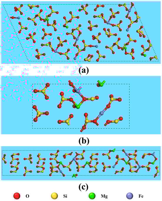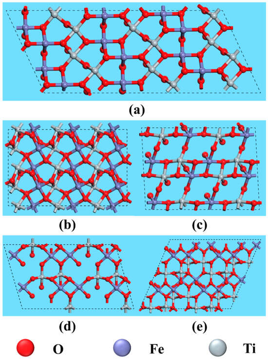 The anisotropy of crystals results in differences in the properties of various crystal planes, primarily due to variations in atomic arrangement and bond strength. Consequently, the interaction between exposed crystal planes and reagent molecules differs, ultimately affecting flotation outcomes. Figure 8 and Figure 9 illustrate the atomic arrangements of different cleavage planes of ilmenite and titanaugite, respectively, with appropriate unit cell expansions to better represent the crystal periodicity. The crystal structure information depicted in these figures is summarized in Table 4 and Table 5.