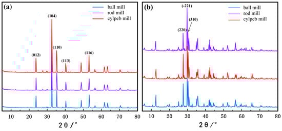 To analyze the exposure of different crystal planes in the milled ilmenite and titanaugite samples, X-ray diffraction (XRD) tests were conducted, and the diffraction patterns are shown in Figure 10. The intensity of the diffraction peaks corresponding to a specific crystal plane in the XRD pattern effectively reflects its exposure proportion in the mineral particles. By comparing the intensities of the diffraction peaks in the XRD patterns, the relationship between the exposure proportion of each crystal plane and the shape of the grinding media can be determined. Normalization of the XRD patterns was performed by defining the sum of the characteristic peak intensities of each major crystal plane as 100%, and the percentage of diffraction intensity was used to represent the relative proportion of a specific crystal plane. The results are presented in Table 6. The data indicate that, regardless of the grinding media shape, the (104) plane is the most exposed in ilmenite. Among the samples, the cylpeb-milled sample exhibits the highest proportion of the (104) plane at 45.78%, while the proportions in the ball-milled and rod-milled samples are 43.39% and 45.12%, respectively. In contrast, the (−221) plane is the most exposed in titanaugite, with the rod-milled sample showing the highest proportion of the (−221) plane at 53.86%, while the proportions in the ball-milled and cylpeb-milled samples are 37.76% and 38.71%, respectively. This suggests that using cylpebs as grinding media is more likely to generate a higher proportion of the (104) plane in ilmenite while avoiding excessive exposure of the (−221) plane in titanaugite.