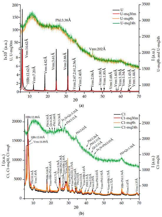 The observed changes in adsorption properties are strongly correlated with mineralogical transformations and crystallinity loss. For sample U, crystallinity decreased from 66.37% to 3.47% after 24 h, coinciding with hydrobiotite formation at 30 min of treatment and vermiculite structural changes. This loss of crystallinity correlated with an initial increase in adsorption capacity, though prolonged treatment led to a decline. In C1, gradual crystallinity reduction (from 33.25% to 6.30%) accompanied mineralogical simplification, where the initial vermiculite-phlogopite-hydrobiotite mixture evolved into simpler phases, culminating in phlogopite and quartz after 24 h of treatment. This transformation coincided with peak adsorption at 8 h of treatment (4.0 mmol/g). C2 experienced rapid crystallinity loss (from 55.86% to 5.11%) and new phase appearances, such as Fe3Si. Its maximum adsorption capacity at 30 min of treatment (2.26 mmol/g) coincided with a mineralogical transition phase retaining vermiculite. C3, despite its initially low crystallinity (12.43%), exhibited significant mineralogical transformations, with moganite and Fe3Si formation correlating with a dramatic adsorption capacity increase at 30 min.