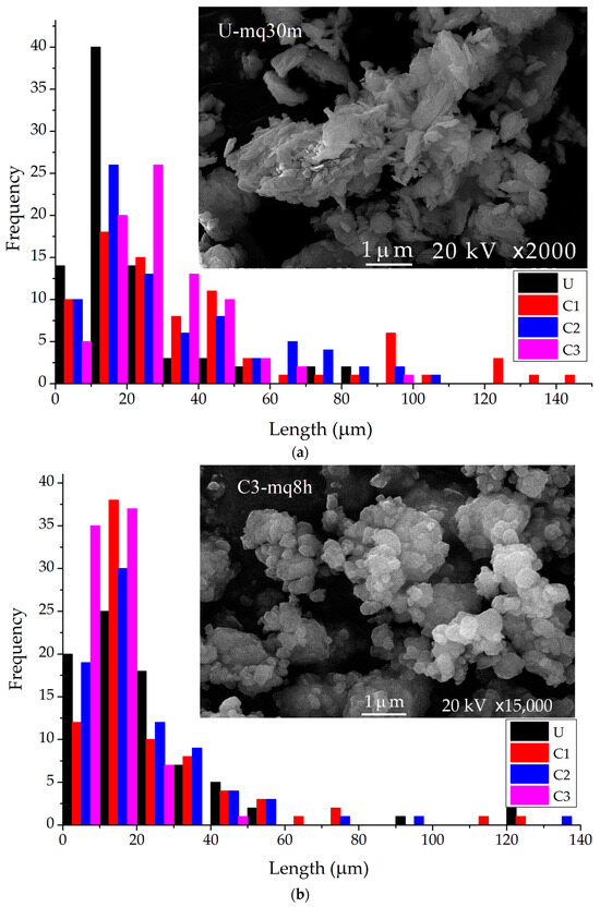 The detailed analysis of the histograms and tabulated data reveals significant patterns in the behavior of particles subjected to mechanochemical treatment. For the 30-min treatment, the samples exhibited a heterogeneous size distribution, with maximum values ranging from 85.31 µm (sample U) to 146.61 µm (sample C1). The distributions of particle size are asymmetric and show an extended tail towards larger sizes, which was reflected in the high standard deviations, particularly notable in C1 (35.64 µm) and C2 (25.52 µm). After 8 h of treatment, relatively large particles persisted, with maxima similar to those observed at 30 min, except for sample C3-mq8h, which showed a significant reduction in both its maximum value (44.67 µm) and standard deviation (7.77 µm). The most dramatic change is observed after 24 h of treatment, where all samples experienced a substantial reduction in particle size, reaching submicrometric dimensions. At this point, the distributions become narrower and more symmetric, as demonstrated by the low standard deviations range (0.11–0.41 µm).