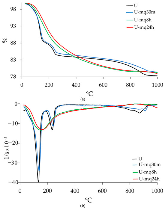 The TG, DTG, and SDTA curves of the starting and treated samples U, C1, C2, and C3 are presented in Figure 4, Figure 5, Figure 6 and Figure 7, respectively, for each mechanochemical experimental time. The integral thermogravimetric analysis of the samples reveals distinctive patterns and significant transformations associated with mechanochemical treatment. In the TG curves, the untreated U sample exhibited a gradual mass loss characteristic of pure vermiculite, with well-defined stages of surface dehydration, interlayer water loss, and dehydroxylation. Mechanochemical treatment induced a progressive reduction in total mass loss, which was more pronounced after 24 h.