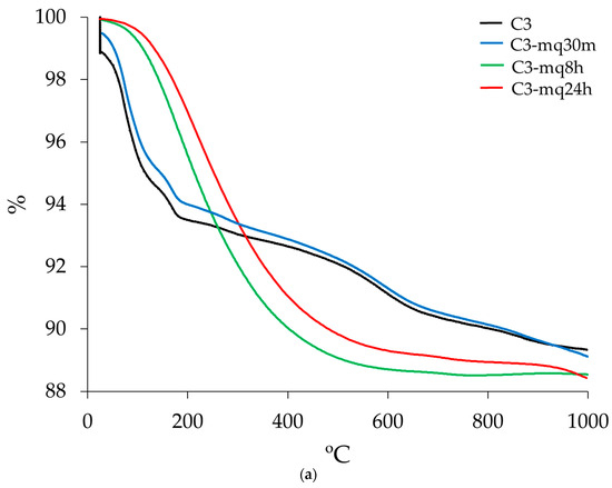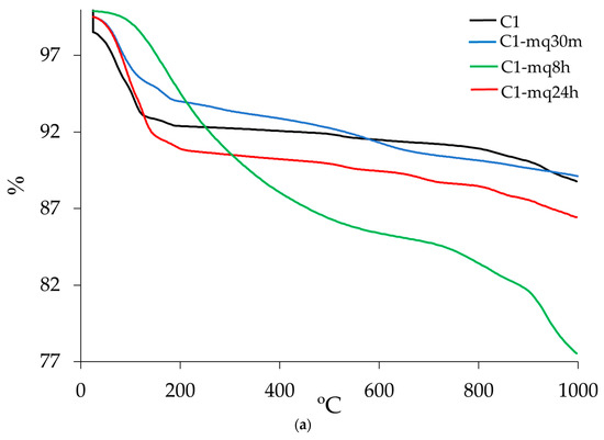 The progressive reduction in total mass loss induced by the mechanochemical treatment would coincide with partial transformation to hydrobiotite. The more complex thermal behavior of samples C1, C2, and C3 would reflect their initial mixed mineralogical composition. Particularly, C1 and C2 presented higher mass losses in the initial dehydration stages, attributable to the presence of phlogopite and hydrobiotite.