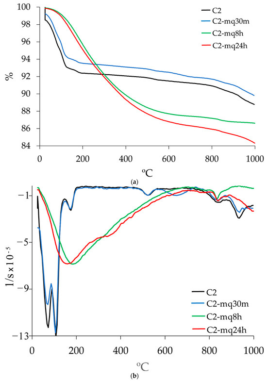 The TG curves of all investigated samples (Figure 4a, Figure 5a, Figure 6a and Figure 7a, respectively) show two steps. The first step, from 25 to about 250 °C, is due to the loss of adsorbed water on the surface and/or localized in the interlayer space of vermiculites [34,35]. The second step, at temperatures above 800 °C, show an additional mass loss due to recrystallization into new phases or to a transformation process associated with the dehydroxylation of OH− anions in the octahedral layer [7,34]. In general, all treated samples lost less mass than untreated ones. Water loss varied significantly among treated samples, with C2 losing the least and C1 the most.