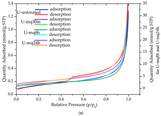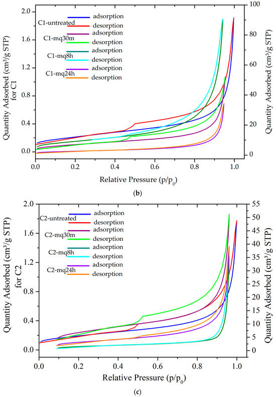 Adsorption isotherms of samples: (a) U samples (U-untreated, U-mq30m, U-mq8h, U-mq24h), (b) C1 samples (C1-untreated, C1-mq30m, C1-mq8h, C1-mq24h), (c) C2 samples (C2-untreated, C2-mq30m, C2-mq8h, C2-mq24h), (d) C3 samples (C3-untreated, C3-mq30m, C3-mq8h, C3-mq24h).