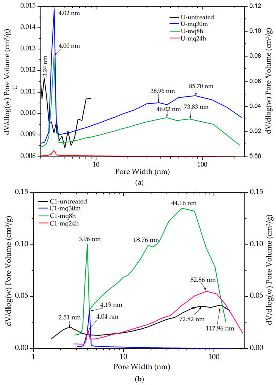 Pore size vs dV/dlog(w) graphs: (a) U samples (U-untreated, U-mq30m, U-mq8h, U-mq24h), (b) C1 samples (C1-untreated, C1-mq30m, C1-mq8h, C1-mq24h), (c) C2 samples (C2-untreated, C2-mq30m, C2-mq8h, C2-mq24h), (d) C3 samples (C3-untreated, C3-mq30m, C3-mq8h, C3-mq24h).