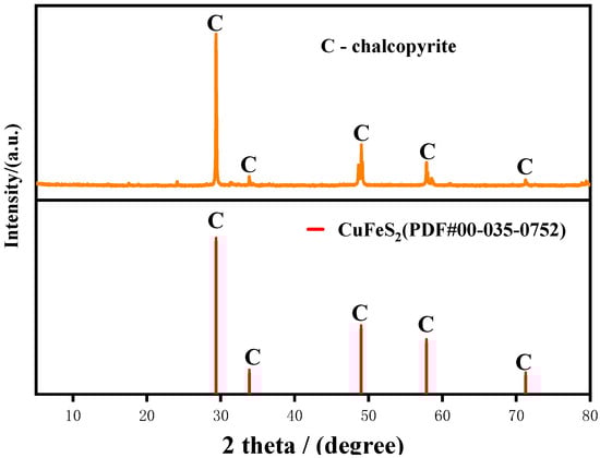 High-purity chalcopyrite was purchased from Yunnan Province, China. Some bulk samples were hand picked for ICP, XPS and SEM-EDS analysis, whereas the rest were crushed using a laboratory jaw crusher and porcelain ball mill. Mineral particles of −74 + 38 µm fraction were separated through standard sieves and used in DO tests. Finer powders of −10 µm were utilized for XRD and XPS measurements. To prevent oxidation, all prepared samples were vacuum-packed in bags, and they were stored in the low-temperature (−2 °C) environment of the refrigerator. The XRD spectra of the chalcopyrite sample are shown in Figure 1. The results of chemical element analysis show that the Cu, Fe and S contents of chalcopyrite were 32.95%, 29.96% and 34.15%, respectively, and other impurities are mainly quartz. The theoretical Cu content of chalcopyrite is 34.56%, So its purity can be calculated to be 95.34%.
