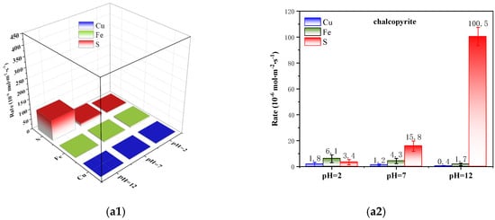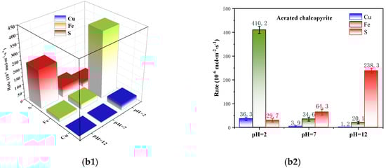 Figure 3 shows the specific corrosion rates of Cu, Fe and S of chalcopyrite under different pH and pulp-aeration conditions. Without the treatment of pulp aeration, the corrosion of Cu, Fe and S was slow, and it showed different variation trends under different pH conditions, as depicted in Figure 3(a1,a2). For example, the specific corrosion rates of Cu, Fe and S were 1.8 10−6, 6.1 10−6 and 3.4 10−6 mol·m−2s−1 at pH 2.0, respectively. Among them, the specific corrosion rate of Fe was the fastest, followed by S, and Cu was the hardest to dissolve. With increased pulp pH, the specific corrosion rate of metal elements Cu and Fe decreased, whereas that of the non-metal element S increased gradually. Up to pH 12.0, the specific corrosion rates of Cu and Fe decreased to 0.4 10−6 and 1.7 10−6 mol·m−2s−1, respectively, whereas that of S increased to 100.5 10−6 mol·m−2s−1, respectively. Therefore, the corrosion rates of the mineral-forming elements Cu, Fe and S of chalcopyrite differed, exhibiting asymmetric corrosion characteristics.