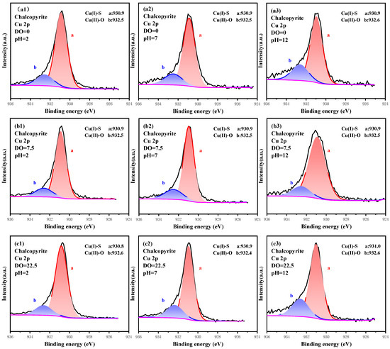 The high-resolution narrow spectrum of Cu 2p was recorded under different oxidation conditions, and the oxidation characteristics of Cu sites are plotted in Figure 4, while the relative contents are listed in Table 2. The signal of Cu 2p was divided into two peaks, and the major peak located at 930.9 eV was attributed to Cu(I)-S, which originated from the chalcopyrite crystal lattice [31,32,33]. The minor peak which appeared at 932.5 eV was represented as Cu(II)-O, which resulted from the oxidation of Cu sites [34,35,36]. More Cu(II)-O corresponded with the deeper oxidation of Cu sites. Under the non-pulp-aeration system, the content of Cu(I)-S was 83.33% at pH 2.0, which dropped to 81.30% and 75.76% at pH 7.0 and 12.0, whereas that of Cu(II)-O increased from 16.67% to 24.24%. Thus, the pH affected the oxidation of surface Cu sites, and high alkaline conditions favored the generation of Cu(II)-O. In contrast to pulp pH, the impact of pulp aeration on the oxidation of Cu sites was small. For example, at pH 12.0, the content of Cu(II)-O was 24.24%, 24.78% and 23.66% when the aeration flow was 0.00, 20.00 and 100.00 mL/min, respectively. These almost unchanged Cu compositions demonstrated that the Cu sites were stable enough under the pulp-aeration system. Overall, given that the Cu sites on chalcopyrite had sufficient stability, the oxidation-aiding effect by pulp pH and aeration were weak, and Cu(I)-S was the dominant component of Cu sites.