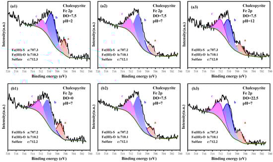 The Fe 2p signal of chalcopyrite under different oxidation conditions is recorded in Figure 5, and the relative content of Fe compositions is listed in Table 3. According to the literature, the Fe 2p spectrum was fitted with Fe(III)-S, Fe(III)-O and sulfate at 707.2, 710.3 and 712.2 eV, respectively [37,38,39,40]. Among them, Fe(III)-S represented the crystal lattice of chalcopyrite, whereas Fe(III)-O and sulfate were the products of surface oxidation. Thus, the contents of Fe(III)-O and sulfate were positively correlated with the oxidation of Fe sites. From the perspective of pulp pH, the content of native Fe(III)-S decreased with increased pH, whereas that of Fe(III)-O and sulfate increased gradually. In particular, the content of Fe(III)-S decreased from 20.21% to 13.87% as pH increased from 2.0 to 12.0, whereas the content of Fe(III)-O increased from 53.19% to 55.80%, and that of sulfate increased from 26.60% to 30.32%. Simultaneously, pulp aeration can strengthen the oxidation of Fe sites. With increased DO from 0.00 mg/L to 22.50 mg/L, the content of Fe(III)-S dropped from 21.76% to 14.66%, whereas that of sulfate increased from 19.41% to 32.98%. Compared with Cu sites, the native Fe(III)-S accounted for only around 20%, and the oxidation products of Fe(III)-O and sulfate dominated the surface after oxidation. This finding indicated that Fe sites were more active and more easily oxidized than Cu sites.