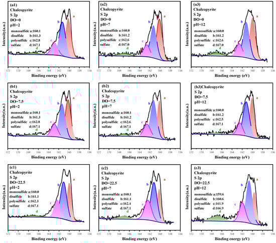 The S 2p spectrum was analyzed to reveal the oxidation characteristics and compositions of S sites under different pulp pH and aeration conditions. The spectrum is plotted in Figure 6, and the relative contents are listed in Table 4. The S 2p XPS spectra of chalcopyrite were divided into four chemical states, and the peak at binding energy of 160.0 eV was attributed to monosulfide (S2−), whereas the characteristic peak at 161.2 eV was ascribed to disulfide (S22−) [41,42]. The fitting peaks at 162.6 and 167.0 eV corresponded with polysulfides (Sn2−) and sulfates (SO42−), respectively [43]. Among them, S2− originated from the lattice of chalcopyrite itself, S22− and Sn2− was the product of weak oxidation, whereas SO42− was generated from strong oxidation. These species did not belong to the raw crystal lattice of chalcopyrite; they originated from the fractured S-Fe/S-Cu bond that further regenerated S-S and S-O bonds. The occurrence of high valence of polysulfides (Sn2−) and sulfates (SO42−) indicated that the surface of chalcopyrite was oxidized. When the DO was 0.00 mg/L, the content of each S 2p component was almost unchanged under various pH conditions, but they changed obviously at higher DO conditions. Under the weak pulp-aeration condition (DO = 7.50 mg/L), the total content of S2− and S22− dropped from 82.01% to 77.59% as pH increased from 2.0 to 12.0. Meanwhile, the total content of Sn2− and SO42− increased from 17.99% to 22.41% before dropping to 67.46% and increasing to 32.54% at pH 12.0 under stronger aeration conditions (DO = 22.50 mg/L). Thus, the oxidation-aiding effect of pH on S oxidation was closely related to pulp aeration, and S can be dramatically oxidized under strong alkaline conditions with the support of pulp aeration.