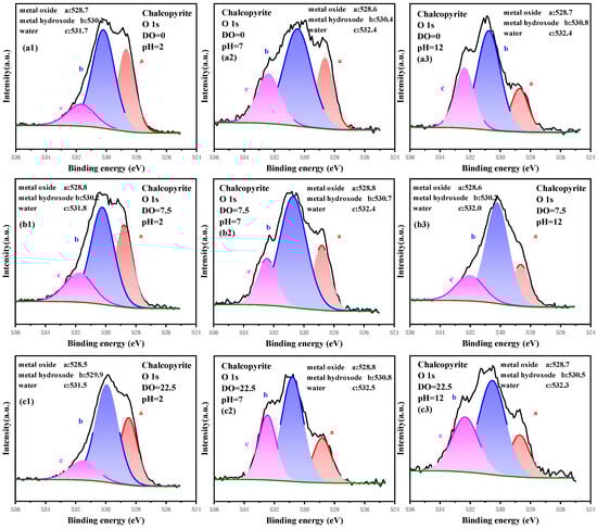 The high-resolution spectrum of O 1s was recorded and analyzed, and the signal was fitted and is plotted in Figure 7. The content of O components is listed in Table 5. The O 1s spectrum was fitted with Me-O, Me-OH and H2O at 528.6, 530.5 and 532.2 eV, respectively [44,45,46,47,48]. Me-O and Me-OH were the products of surface oxidation of metal sites, and they can determine the degree of oxidation. H2O was the adsorbed water during preparation and measurement. From the perspective of pH, the content of Me-O decreased with increased pH, whereas that of Me-OH increased. For example, the content of Me-O and Me-OH was 29.71% and 57.14%, respectively, under the condition of DO 22.50 mg/L and pH 2.0, and the ratio of Me-OH/Me-O was 1.92. With increased pH, the content of Me-O decreased whereas that of Me-OH increased, and the ratio of Me-OH/Me-O increased to 3.08 at pH 7.0. It can further increase to 3.71 at pH 12.0. Herein, the high alkaline condition was favorable to the hydroxylation of metal sites. From the perspective of pulp aeration, the content of Me-O decreased with increased DO, whereas that of Me-OH increased. Taking pH 7.0 as an example, the content of Me-O and Me-OH was 23.94% and 53.19%, respectively, without pulp aeration, and the ratio of Me-OH/Me-O was 2.22. As the DO increased to 7.50 mg/L, the content of Me-O and Me-OH was 22.16% and 59.88%, respectively, whereas the ratio of Me-OH/Me-O increased to 2.70. At a higher DO of 22.50 mg/L, the content of Me-O further dropped to 19.25, and that of Me-OH was 59.45%, resulting in an increased ratio of Me-OH/Me-O to 3.08. This finding indicated that the hydroxylation of metal sites was further enhanced. Therefore, increasing pulp aeration and pH also affected the strengthening surface metal–site hydroxylation.