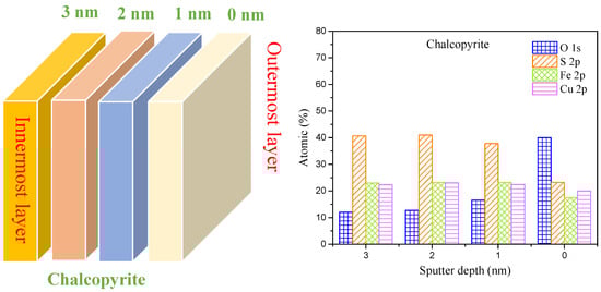 Figure 8 depicts the variation in surface elements at different etching depths. At the etching depth of 3.0 nm, the content of Cu, Fe and S was 22.40%, 23.70% and 41.70%, in line with the ratio of the CuFeS2 lattice (1:1:2). Meanwhile, the content of O was only 12.20%, illustrating that chalcopyrite was almost un-oxidized at this depth. With decreased etching depth to 2.0 nm, the content of Cu, Fe and S was the same as that at 3.0 nm, demonstrating that chalcopyrite was not oxidized at this layer. However, at 1.0 nm etching depth, the content of O increased to 16.50% and that of S decreased to 37.60% owing to surface oxidation. At the outset layer of chalcopyrite, the content of Cu and Fe dropped slightly, but that of S dropped to 23.10% and O increased to 40.20%. Overall, the degree of oxidation gradually increased from the innermost layer to the outermost, and S was gradually lost as surface oxidation increased, exhibiting significant S-removing features.