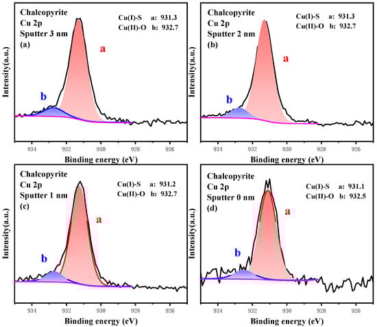 For surface etching, the bulk chalcopyrite was cut and polished to obtain regular blocks of 10 mm × 10 mm × 5 mm; then, it was treated under different oxidation conditions and dried with nitrogen. Once the bulk sample was placed in a vacuum chamber, the etching mode was used to obtain depth surface information. A single atom was used as an ion source to bombard and etch the sample surface, and each layer was analyzed to acquire depth profile information for different oxidation stages. The etching time was 5 s per session, and the etching depth was about 1 nm. The equipment used was an ESCALAB250Xi manufactured by Thermo Fisher Scientific (Waltham, MA, USA).