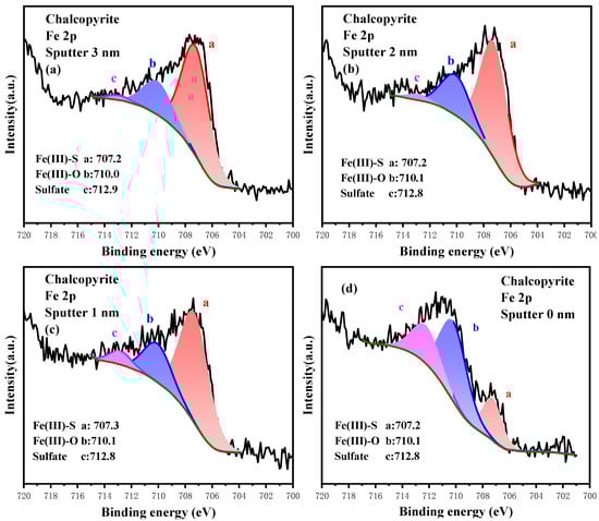 The high-resolution spectrum of Fe 2p at different etching depths is plotted in Figure 10, and the relative content of Fe 2p composition is listed in Table 7. At 3.0 nm etching depth, the Fe sites primarily existed in the form of sulfide Fe(III)-S, and their content was 73.63%. Meanwhile, the existence of the oxidation products Fe(III)-O and sulfate was weak, and their contents were 24.26% and 2.21%, respectively. As the etching depth became shallower and surface oxidation was enhanced, the content of Fe(III)-S decreased gradually, whereas that of Fe(III)-O and sulfate increased. Specifically, the content of Fe(III)-S severely dropped to 22.44% on the outermost layer, but that of Fe(III)-O increased to 51.37% and that of sulfate increased to 26.19%. Ultimately, the dominant components on chalcopyrite surface changed from metal sulfides to metal oxides and sulfates. Compared with Cu sites, the Fe sites on chalcopyrite surface were more prone to oxidization. Their gradual oxidation involved conversion from Fe(III)-S with lower binding energy into Fe(III)-O with higher binding energy, followed by sulfate with the highest binding energy.