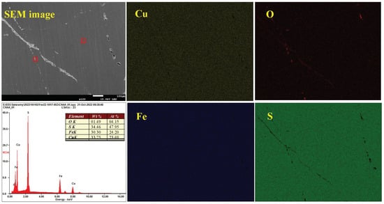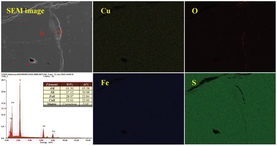 Figure 13 depicts the surface morphology and element composition of chalcopyrite magnified 100× after oxidation at pH 2.0. Approximately, the micro-surface was smooth and flat, and the contents of Cu, Fe and S were 22.60%, 22.84% and 50.98%, respectively, in accordance with the ratio of 1:1:2. Meanwhile, O was present in trace amounts and its content was only 3.58%, indicating weak oxidation of the macroscopic surface. Additionally, the distribution of O was uneven and obviously O-rich regions existed, indicating non-uniform oxidation–corrosion of chalcopyrite.