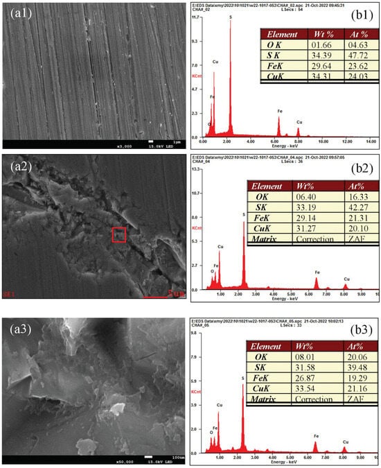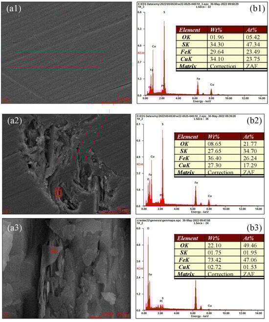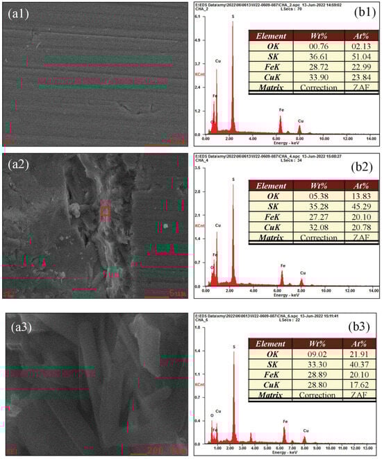 Figure 16 shows the oxidation morphology and EDX spectra of various microregions of chalcopyrite at pH 7.0. A point (A) in the weakly oxidized region (Figure 15) was selected and magnified to 3000×, and the results are depicted in Figure 16(a1,b1). The microsurface of the weakly oxidized area was smooth and uniform, and the content of O was 2.13%, confirming weak surface oxidation. Meanwhile, a point (B) in the strongly oxidized region (Figure 15) was selected and magnified 3000×. In Figure 16(a2,b2), a huge ravine ruined through the entire image, the edges and interior of the gully were undulating and uneven, causing high roughness and obvious surface corrosion. Meanwhile, the content of O was as high as 16.33%, whereas those of Cu, Fe and S dropped. This finding indicated that the oxidation degree of this microarea was stronger. Figure 16(a3,b3) shows the morphology and elemental content of the microscopic surface of point (C) in Figure 14(a2) under 50,000× magnification. Compared with Figure 16(a2) under 3000× magnification, the contents of Cu, Fe and S further dropped to 21.16%, 19.29% and 39.48%, and that of O increased to 20.06%, demonstrating strong surface oxidation. From the perspective of surface morphology, this micro-area was filled with numerous tightly packed sheet-like scales, showing a cracking phenomenon. The scales were large or small and had a low thickness and significant corrosion characteristics. Therefore, a higher oxidation degree corresponded with a more obvious corrosion phenomenon in the area. The oxidation micro-zone and the corrosion micro-zone greatly overlapped; that is, surface corrosion became more significant with increased surface oxidation. Oxidation and corrosion jointly affected the surface morphology and elemental composition of chalcopyrite.