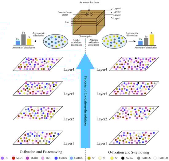 Combined with the above analysis, we concluded that the ore-forming elements Cu, Fe and S in chalcopyrite possessed oxidation characteristics, and a significant number of electrons were lost during oxidation from the sulfide form in the lower chemical state to the metal oxide/hydroxide and sulfate in the higher chemical state. This process cannot be completed in one step and underwent hierarchical oxidation. Additionally, oxidation was accompanied by the asymmetric corrosion of mineral-forming elements and the fixation of O elements in solution, which was a complex oxidation–corrosion and material-exchange system. According to different oxidation–corrosion degrees, oxidation–corrosion was divided into several different stages, and the hierarchical oxidation–asymmetric corrosion model of the critical active layer of sulfide minerals was constructed.