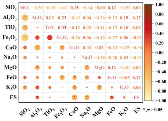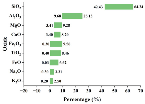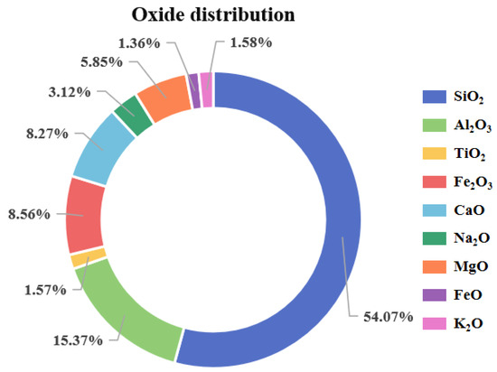 Previous studies have shown that the elastic modulus of basalt fibers is closely related to their chemical composition. The primary chemical composition of SiO2, Al2O3, CaO, MgO, FeO, and Fe2O3 has various effects on the lattice structure, which, in turn, affects the elastic modulus of the basalt fibers and, consequently, the mechanical properties of basalt-reinforced composites. Ding et al. compared the elastic modulus of basalt fibers and glass fibers, finding that the elastic modulus of basalt fibers is approximately 18% higher than that of glass fibers [16]. Research from Deák et al. shown that SiO2 and Al2O3 are the main components of basalt fibers, and increasing their content can enhance the elastic modulus of basalt fibers [17]. The sum of the content of SiO2 and Al2O3 has a high correlation with the elastic modulus of basalt fibers, with a correlation coefficient of up to 0.80. Oxides formed from ions with a greater ionic radius and lower charges, like Na+, K+, and Ba2+, do not favor the enhancement of the elastic modulus. On the other hand, oxides consisting of ions with a smaller ionic radius and higher polarization abilities, such as Li+, Be2+, Mg2+, AI3+, and Ti4+, contribute to an increased elastic modulus [18].