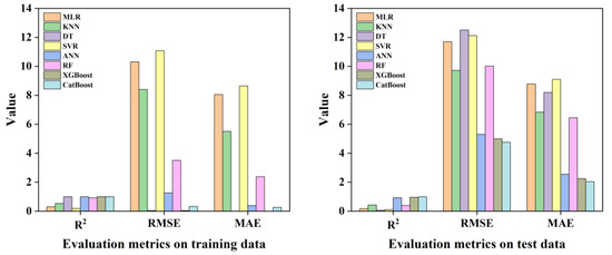 The R2 values of the models DT, ANN, XGBoost, and CatBoost on the training set are nearly 1, accompanied by lower RMSE and MAE values, indicating strong performance during training. On the test set, the CatBoost model achieves an R2 of 0.9554, an RMSE of 4.7556, and an MAE of 2.0323, demonstrating the lowest error and the highest degree of fit. Although the R2, RMSE, and MAE values of XGBoost are comparable to those of CatBoost, the latter outperforms XGBoost in terms of overall error reduction and predictive accuracy. The ranking of predictive accuracy among the models is as follows: CatBoost, XGBoost, ANN, KNN, RF, MLR, SVR, and DT. CatBoost’s superior performance is attributed to its ability to handle nonlinear relationships, work effectively with small datasets, minimize overfitting, and automatically optimize hyper-parameters. These advantages position it as the best-performing model in this study, surpassing other tree-based algorithms such as RF and DT. Furthermore, the study highlights CatBoost’s strong adaptability to small datasets, further demonstrating its robustness in predictive tasks. Overall, these findings confirm that the CatBoost model delivers the highest predictive accuracy among all models evaluated.