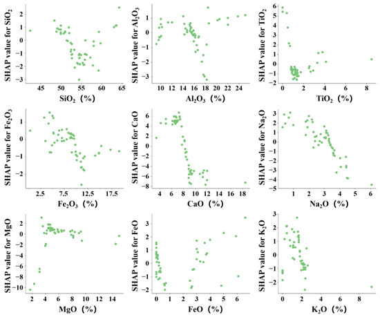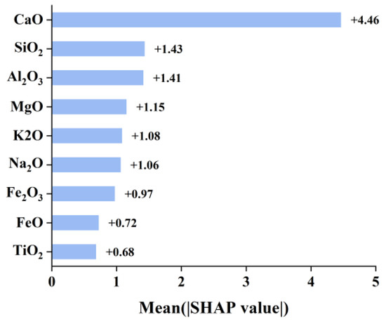 - The SHAP results revealed a ranking of the input variable importance for the XGBR model of, in descending order, CaO > SiO2 > Al2O3 > MgO > K2O > Na2O > Fe2O3 > FeO > TiO2.