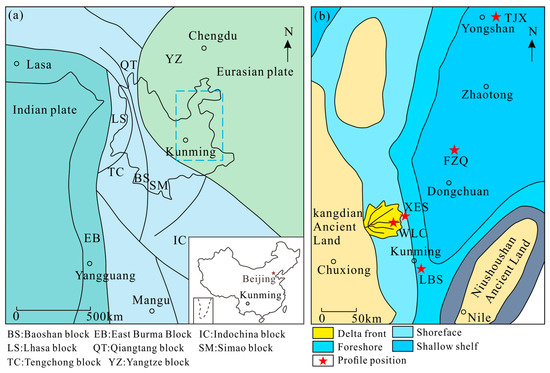 Figure 1. (a) Tectonic location of the southwestern margin of the Upper Yangtze, (b) Plane sedimentary facies map and profile location map of the WLQ Formation.
