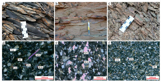 Figure 3. Representative macro and micro photographs of WLQ strata in the sampling Section. (a). Silty shale, FZQ section; (b). Gray mudstone interbedded with thin lenticular sandstone, LBS section; (c). Gray-green shale, XES section; (d). Siltstone, FZQ section; (e). Fine-grained quartz sandstone, LBS section; (f). Fine-silt-grained quartz sandstone, XES section. Quartz (Qtz); K-feldspar (Kfs); Carbonate mineral (Cb); Muscovite (Ms); Biotite (Bt); Metamorphic rock fragments (Lm); Sedimentary rock fragments (Ls).