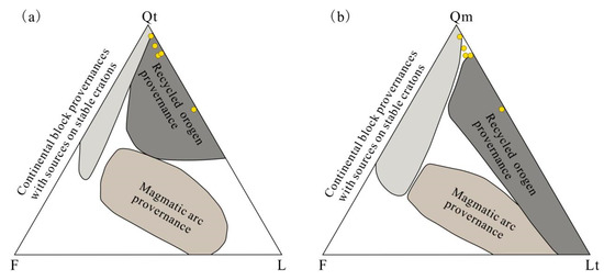 Figure 4. Ternary plots for the Carboniferous–Permian sandstone modal composition data from the North Qaidam tectonic belt. Provenance fields are from Dickinson and Suczek [16]. (a): Triangular QtFL plot; (b): Triangular QmFLt plot. Qt-total quartz; Qm-monocrystalline quartz; K-K-feldspar; Pl-plagioclase; L-lithic fragment; Qt-Qm + Qp; F-K + Pl; Lt-L + Qp.