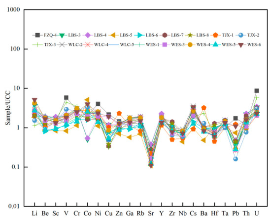 The concentrations of trace elements in the samples from the WLQ Formation are presented in Table 4. To comprehensively analyze the enrichment characteristics of these elements, the trace elements in the WLQ Formation samples were normalized against the Upper Continental Crust (UCC) standards. The resulting normalization spider diagrams are depicted in Figure 5 detailed examination of these diagrams reveals that, in contrast to the Upper Continental Crust, elements such as Li, Co, Y, Cs, and U exhibit relatively higher enrichment levels within the WLQ Formation samples. Conversely, the element Sr displays a relatively depleted state, as clearly illustrated in Figure 5. This distinct pattern of element enrichment and depletion provides crucial insights into the geochemical processes and source characteristics associated with the WLQ Formation.
