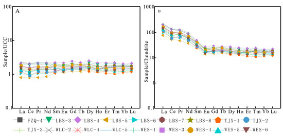 Figure 6. (A): UCC-normalized REE distribution patterns of samples from the WLQ Formation; (B): Chondrite-normalized REE distribution patterns of samples from the WLQ Formation.