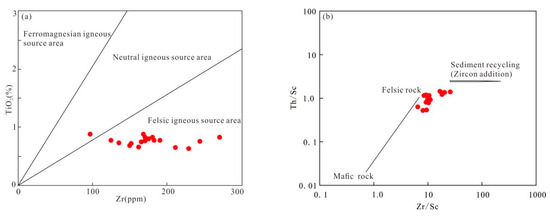Figure 7. Provenance discrimination diagrams: (a) TiO2 vs. Zr; (b) Th/Sc vs. Zr/Sc.