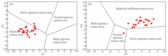 Previous research results have shown that the major element composition of clastic sedimentary rocks is also greatly related to the composition of the source rocks area, and major element related discriminant diagrams have also been well applied in the analysis of source rock composition characteristics [44,53]. Moreover, Roser and Korsch [54] devised discriminant functions of F1 to F2 and F3 to F4 for determining the provenance of the WLQ Formation. With the exception of two samples situated in the felsic igneous rock source area (Figure 8a) and one sample in the neutral igneous rock source area (Figure 8b), the majority of the samples within the WLQ group are positioned in the quartzite sediment source zone [54]. These results indicate that there existed a relatively stable material source during the depositional period of the WLQ Formation.