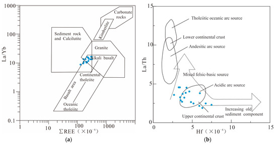 Figure 9. (a) Discrimination diagrams for the provenance attributes of the sample in the WLQ Formation; (b) Discriminant map of sedimentary rock provenance properties, La/Th vs. Hf.