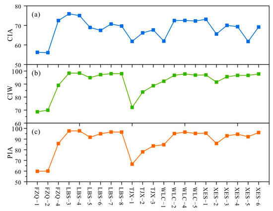 All samples collected from the WLQ Formation along the southwestern margin of the Yangtze Platform, comprising both sandstone and mudstone, exhibit Chemical Index of Alteration (CIA) values ranging from 56.08 to 75.92 (average: 68.03), Chemical Index of Weathering (CIW) values between 68.73 and 98.40 (average: 68.73), and Plagioclase Index of Alteration (PIA) values from 59.79 to 97.67 (average: 88.08). A strong correlation among CIA, PIA, and CIW values is evident (Figure 10). These indices collectively indicate a moderate level of chemical weathering, consistent with warm and humid paleoclimatic conditions in the region [49,50].