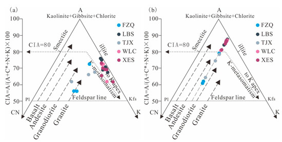 Figure 11. Ternary diagrams of A-CN-K for the WLQ Formation samples. (a) Before correction, (b) After correction; Abbreviations: A—Al2O3, CN—CaO*+ Na2O, K—K2O.