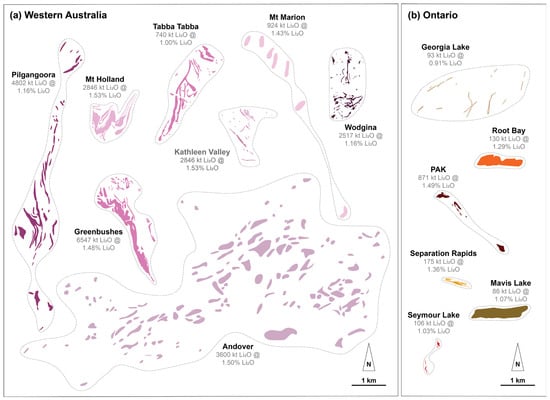 LCT pegmatites constitute a major economic resource of lithium. For example, in 2022, this deposit type accounted for almost 30% of global lithium resources and 60% of global lithium production [5]. LCT pegmatites in the Precambrian terrains of Western Australia (Australia) and Ontario (Canada), the subject of this study, are very well endowed regarding lithium. Western Australia ranks fourth in terms of global lithium resource endowment and is the world’s largest lithium supplier. Total resources amount to ~2000 Mt of ore for 26 Mt of contained lithium oxide (Li2O), or lithia, contained in 19 LCT pegmatite deposit clusters (Figure 1; Table 1) [6]. The lithium mined in Western Australia to date has come entirely from LCT pegmatites of the Archean Pilbara and Yilgarn cratons. These two cratons host almost the entire Western Australian lithium endowment except for the Malinda lithium resource, which is hosted in LCT pegmatites of the Proterozoic Gascoyne Orogen. Greenbushes, located in the southwestern Yilgarn Craton, is not only the largest LCT pegmatite deposit in Western Australia, but it is also the largest operating hardrock lithium mine in the world [6,7]. Ontario, on the other hand, does not have any producing lithium mines; although, it is host to a number of advanced projects [8,9], some of which are moving towards production. Total resources are estimated at just under 120 Mt of ore for ~1.5 Mt Li2O contained in seven LCT pegmatite deposit clusters (Figure 2; Table 2), which are all located in the Archean Superior Craton.