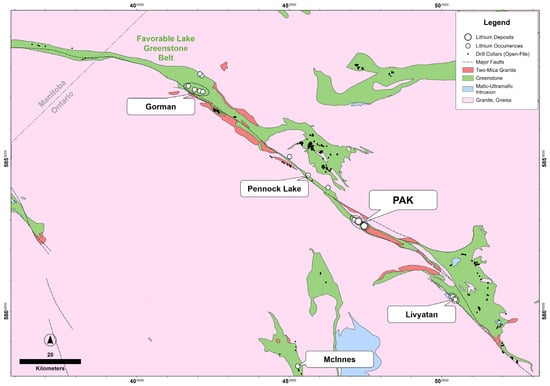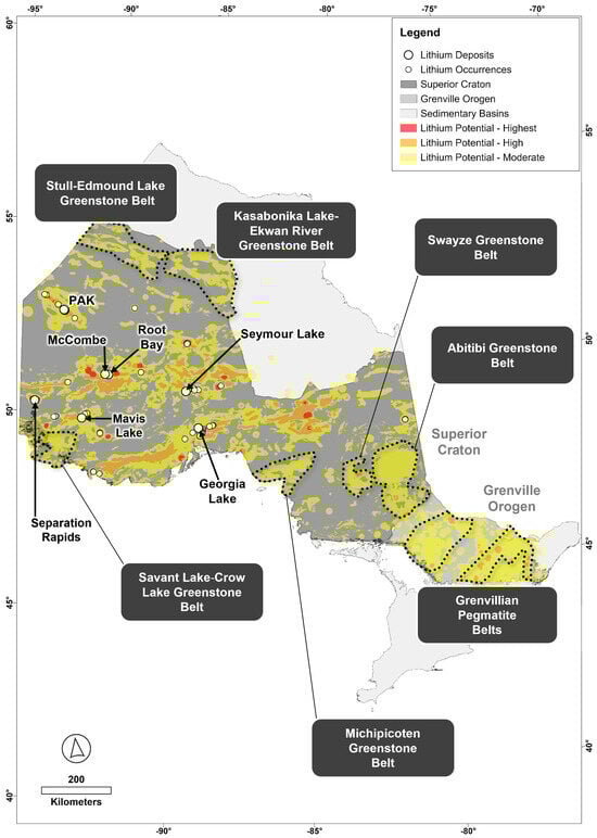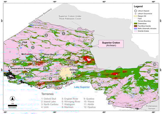 All figures are rounded. All resources are LCT pegmatite-hosted and are compliant with either JORC 2012 or NI 43-101. Mineral resources were compiled from [13] for PAK, [14] for Separation Rapids, [15] for Root Bay, Seymour Lake, and McCombe, [16] for Georgie Lake, and [17] for Mavis Lake. Key to abbreviations: Avalon = Avalon Advanced Materials; SC = Superior Craton (Archean).