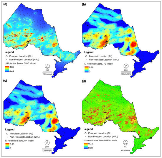 For the purpose of MPM, the GSWA and OGS lithium occurrence data (Figure 1 and Figure 2) had to be ‘cleaned up’ with any ‘non-substantial’ lithium occurrences omitted from the database and modeling process. More specifically, for the MPM, we only used the lithium occurrences that met one or more of the following criteria: the occurrence (i) is, or was, an operating mine with lithium as the principal product or a by-product; (ii) contains a lithium resource; (iii) has returned one or more lithium mineralized drillhole intersections; (iv) is characterized by significant lithium anomalism in sawn channel, trench, or bulk samples; and/or (v) is marked by lithium-in-rock chip ± lithium-in-soil anomalism of significant grade and along a significant trend. Occurrences marked only by sporadic lithium-in-rock chip or lithium-in-soil anomalism or those defined solely by petrographic evidence (e.g., visual recognition of spodumene or lepidolite crystals) were rejected. Regarding Western Australia, 73 lithium occurrences out of a total of 208 lithium occurrences were rejected, with 135 used for MPM. Regarding Ontario, 44 lithium occurrences out of a total of 135 lithium occurrences were rejected, with 78 used for MPM. Summary tables of the Western Australian and Ontarian lithium occurrence data used in this study are provided in the Supplementary Materials (Tables S1 and S2).