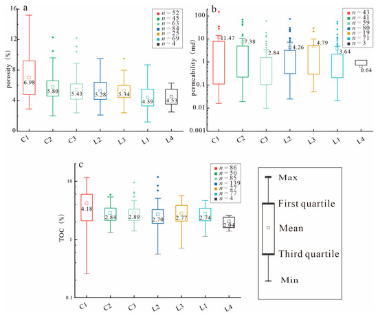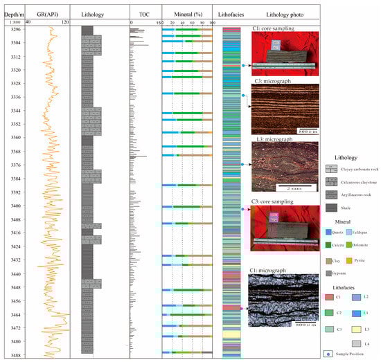 - The physical properties of the combined lithofacies (C1, C2, and C3) were superior to those of other lithofacies, with C1 exhibiting the most favorable physical properties. The high porosity, permeability, and TOC of these lithofacies provide optimal conditions for shale oil enrichment. These three combined lithofacies consist of interlayers of shale/claystone and other highly brittle mineral layers.