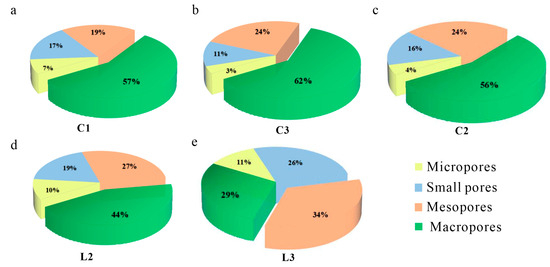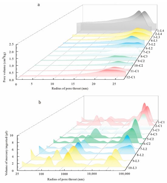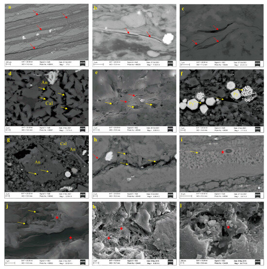 - In this study, reservoir pores were classified into four categories: (i) micropores (<50 nm), predominantly associated with pyrite aggregates and clay mineral aggregates; (ii) small pores (50–500 nm), mainly comprising calcite intergranular pores and intergranular micropores; (iii) mesopores (500–5000 nm), dominated by intergranular macropores and diagenetic microfractures; and (iv) macropores (>5000 nm), consisting primarily of structural microcracks and bedding microcracks. The primary lithofacies (C1, C2, C3) exhibited medium to large pore throats and fractures, the development of which was controlled by mineral composition. These features serve as crucial reservoir spaces and migration pathways for shale oil. SEM observations revealed the spatial distribution and connectivity of these pores, demonstrating that microfractures and intergranular pores play a significant role in both oil storage and flow.