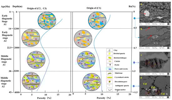 - The formation of micrite (C2 and C3) was attributed primarily to favorable sedimentary conditions during the diagenetic stage. In contrast, C1 lithofacies formation was associated with overpressure, the formation of interlayer bedding, and the incomplete filling of grain calcite. The high-quality reservoir conditions in the combined lithofacies were the result of basic sedimentary lithofacies and diagenetic history.