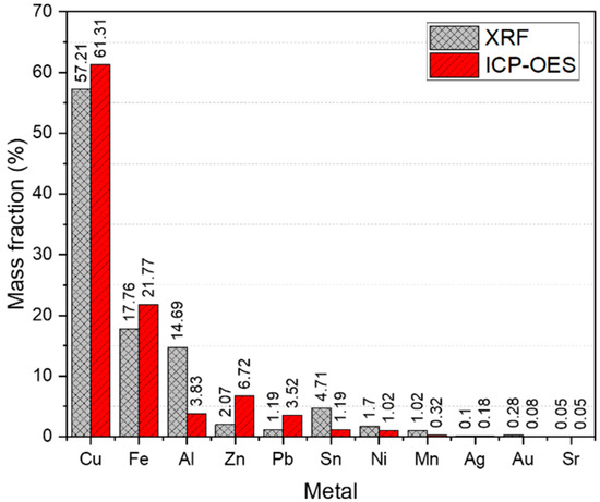 For a better presentation and comparison of the data obtained by ICP-OES and XRF, the weighted average was calculated for the concentrations of the elements that make up the metallic fraction in the WPCBs (, according to Equation (14), where and refer to the proportion of the concentration of the element in the metallic fraction and, and , represents the total fraction of metals in each particle size, and is the metal analyzed. Thus, in Figure 1, we find the results of the weighted averages represented in a bar chart.
