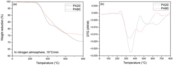 To verify the total fraction of polymers present in the WPCBs, thermogravimetric analyses were conducted for each particle size used to evaluate mass loss as a function of increasing temperature. The results, presented in Figure 2a, show that between 310 °C and 320 °C, there was a rapid decomposition of the material. In all particle sizes, mass reduction stabilized around 750 °C. At this point, the thermogravimetric analysis revealed that particles from the PA80 group had the lowest content of polymeric materials, with a mass reduction of about 24.17%, while PA20 particles exhibited a reduction of 28.93%. Furthermore, Figure 2b displays the graph of the derivative of the thermogravimetric curve, indicating the highest peaks in the range of 300 to 400 °C for all particle size ranges. It was expected that smaller particles, due to their larger surface area, would promote more efficient combustion, resulting in a greater mass variation for the PA80 group, as presented by Kumar et al. (2020) [17]. However, this was not observed, thus suggesting a lesser presence of the polymeric fraction in WPCBs ground to a size smaller than 0.177 mm.