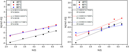 The Avrami kinetics model was also tested to determine the best linear fit for the experimental data. To do this, Equation (10) was adjusted to represent the data in the form of a linear regression, according to Equation (18), for determining the kinetic coefficients and . The results obtained from applying the Avrami model are shown in Table 9 and are graphically represented in Figure 4.